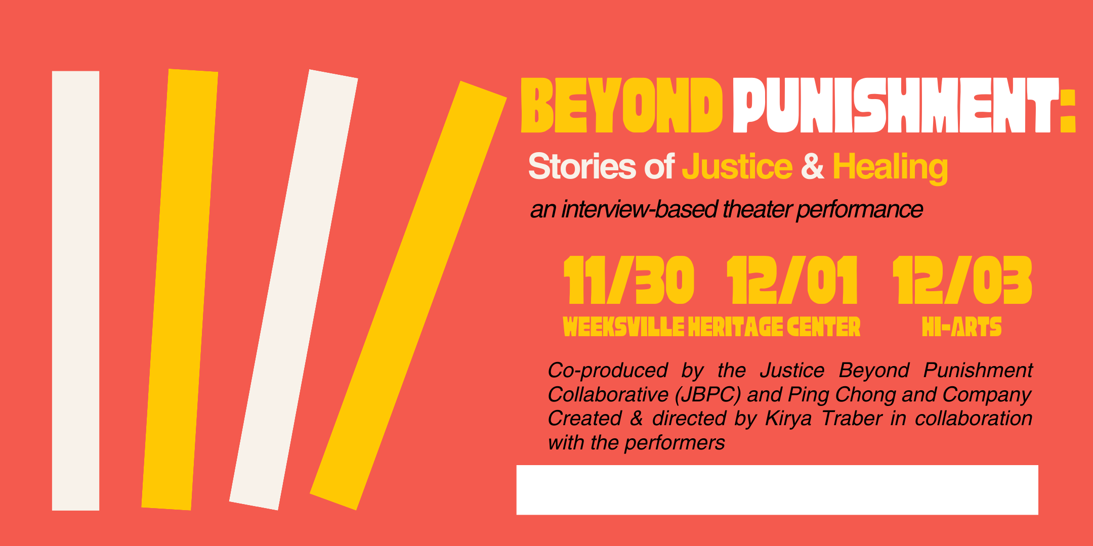 Join us for the world premiere of Beyond Punishment: Stories of Justice and Healing, an original interview-based theater performance co-produced by the Justice Beyond Punishment Collaborative (JBPC) and Ping Chong and Company!